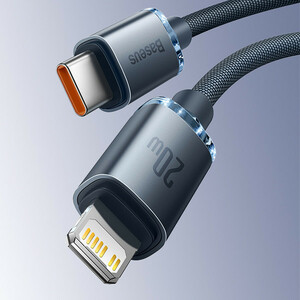 سری کابلهای Crystal Shine Series محصولی از کمپانی Baseus بوده که یک سر آن دارای کانکتور لایتنینگ و سر دیگر دارای کانکتور تایپ سی است. توان این کابل 20 وات (20W) بوده که باعث شده تا کاربران بتوانند با سرعت بالا گوشی خود را شارژ کنند. بدنه این محصول دارای روکش کنفی بوده و همین امر مقاومت آن را در برابر کشش، پارگی و گره خوردن بالا برده است. همچنین روکش کانکتورهای این کابل از جنس آلیاژ آلومینیوم است. مزیت دیگری که این کابل دارد، پوشش خاص آن در قسمت اتصال کابل به کانکتور است. یک محافظ پلاستیکی و سخت در این قسمت وجود دارد که باعث میشود هنگام خم کردن بیش از حد کابل، فشار وارد شده به آن توسط این پوشش کاسته شده و در نهایت مانع از قطع شدن کابل از کانکتور شود؛ حالتی که در بسیاری از کابل ها آن را مشاهده می کنیم. طول کابل لایتنینگ به Type C باسئوس Baseus Crystal Shine Series برابر با 2 متر است و آزادی عمل مناسبی به شما میدهد. این کابل از فناوری فست شارژ PD نیز پشتیبانی میکند که باعث شده بتوانید دستگاههای خود را با سرعت بالا شارژ کنید. توان خروجی این کابل 20W است و با همه دستگاههای آیفونی در این رنج توان سازگار است. شما میتوانید به راحتی با استفاده از این کابل اطلاعات خود را با سرعت 480Mbps انتقال دهید.