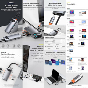 هاب تایپ سی 4 پورت Baseus CAHUB-CY0G Type C Multifunctional HUB Docking Station گاهی اوقات نیاز به درگاهی داریم که روی لپ تاپ، PC یا... وجود ندارد و یا حتی اگر هم وجود دارد اشغال است. از طرفی با وجود باریکتر شدن هر روزهی لپ تاپها هم شاهد کم شدن پورتهای روی بدنه هستیم که ما را با مشکل شدید کمبود پورت مواجه کرده است. هاب 4 پورت Baseus Metal Gleam Series 6-in-1 Multifunctional HUB محصولی از کمپانی بیسوس است که در مجموع 4 پورت متفاوت و پرکاربرد را در اختیار شما میگذارد. با این هاب و با داشتن یک درگاه تایپ سی میتوانید دستگاههای بیشتری را به سیستمتان متصل کنید و محدودیتی نداشته باشید. 4 پورت پرکاربرد و ضروری همانطور که از اسمش پیداست این تبدیل بیسوس مجموعا دارای 4 پورت متفاوت است. از این 4 پورت روی هاب یک عدد پورت USB3.0، یک پورت تایپ سی، یک HDMI و یک پورت USB2.0 داریم که در ادامه مشخصات هر کدام را توضیح میدهیم. پورت USB3.0 و USB2.0: این پورت دارای سرعت انتقال داده 500MB/s یا 5Gbps و شارژ 5V/1.5A است. این سرعت در مقابل سرعت 480Mbps یو اس بی 2 بسیار بیشتر است و کاربری راحتتری را در اختیار شما قرار میدهد. در نظر داشته باشید که این مقدار از سرعت برای جابجا کردن اطلاعات، بستگی به دستگاه شما نیز داشته و سیستم شما هم باید از آن پشتیبانی کند تا بتوانید از سرعت بسیار بالای آن بهرهمند شوید. از پورت USB2.0 میتوانید برای اتصال موس و کیبورد به سیستم استفاده کنید. پورت HDMI: با بهرهگیری از پورت HDMI میتوانید آنچه که در لپ تاپ یا گوشی خود دارید و می خواهید را به نمایشگر بزرگتری مانند تلویزیون منتقل کنید. این پورت از کیفیت 4K پشتیبانی میکند و فرکانس 30 هرتزی دارد. لذا اگر تلویزیون خانگی شما نیز این قابلیتها را دارد به راحتی میتوانی از این هاب برای انتقال صدا و تصویر استفاده کنید و با لذت بیشتری به دیدن فیلم بپردازید. پورت Type-C PD: این درگاه از قابلیت PD بهرهمند است و حداکثر توان آن 100 وات است. شما میتوانید نوت بوکها و لپتاپهای نهایتا 100 واتی را به کمک این درگاه شارژ کنید. تنها کافیست پورت تایپ سی را به برق وصل کرده و کانکتور تایپ سی را به لپ تاپتان متصل کنید.