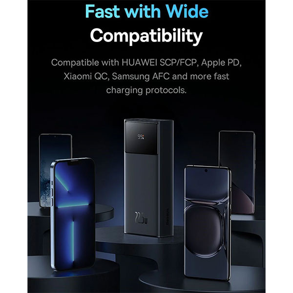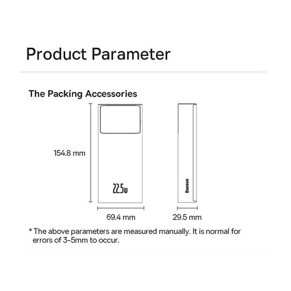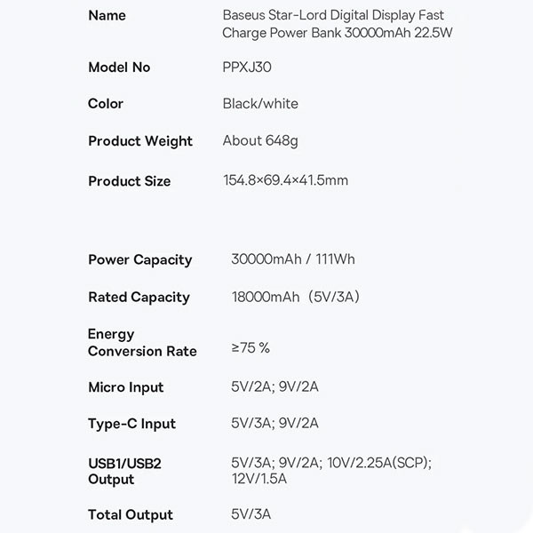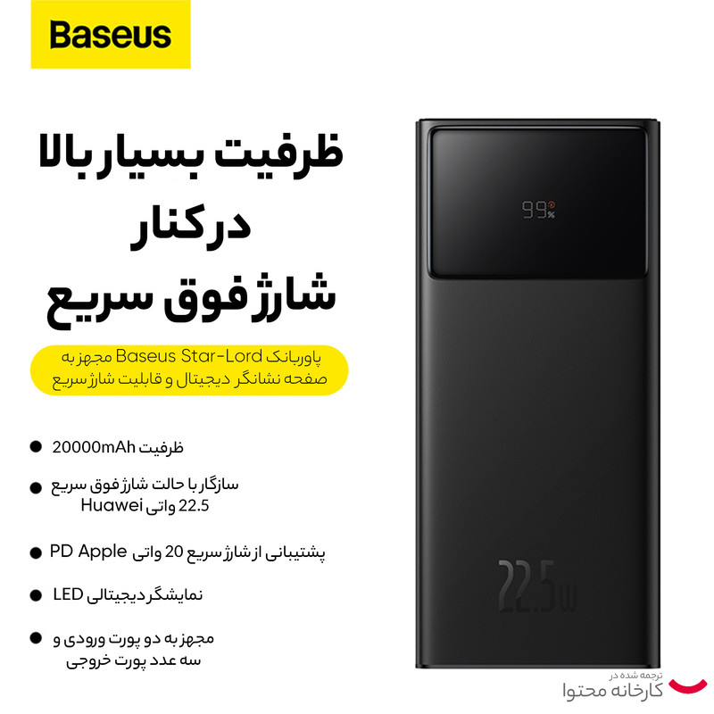 پاوربانک ها به وسیله ای تبدیل شده اند که همیشه و همه جا همراه کاربران هستند و این امر باعث شده تا هر روزه پاوربانک هایی با ظاهر و قابلیتهای جدید به بازار عرضه شوند. پاوربانک Baseus Star-Lord PPXJ060001 دارای ظرفیت اسمی 20000 میلی آمپر ساعت و حداکثر توان خروجی 22.5 وات یکی از پاوربانکهای جدید شرکت بیسوس است. پاوربانک Baseus PPXJ060001 از ABS و PC ساخته شده است و فرآیند آبکاری تابشی باعث شده اثر انگشت را کمتر جذب می کند. نوع باتری آن نیز لیتیوم پلیمری است. برای نمایش میزان شارژ باقی مانده پاوربانک یک نمایشگر دیجیتال روی بدنه پاوربانک بیسوس Star-Lord PPXJ060001 وجود دارد که باتری باقی مانده را به صورت درصد به شما نمایش می دهد. ابعاد پاوربانک برابر 154.8x69.4x29.5 میلیمتر است و وزنی برابر 450 گرم دارد. داخل پک محصول یک کابل Type C به طول 30 سانتی متر با شدت جریان 3A قرار دارد. پاوربانک Baseus PPXJ060001 دارای ظرفیت اسمی 20000 میلی آمپر ساعت است. البته با توجه ولتاژ شارژ گوشی شما این ظرفیت ممکن است کمتر شود. پاوربانک Baseus PPXJ060001 در جمع دارای 3 درگاه شامل 1 درگاه Type C و 2 درگاه USB است. درگاه Type C به صورتی طراحی شده است که هم ورودی و هم خروجی است که برای شارژ پاوربانک نیز از آن استفاده می شود. حداکثر توان خروجی پاوربانک Baseus PPXJ060001 برابر 22.5 وات است. توان ورودی و خروجی پورتهای پاوربانک PPXJ060001 به شرح زیر است. ورودی تایپ سی: 5V/3A | 9V/2A توان 18 وات ورودی میکرو: 5V/2A | 9V/2A توان 18 وات درگاه تایپ سی خروجی: 5V/3A | 9V/2.22A | 12V/1.5A توان 20 وات درگاه USB خروجی: 10V/2.25A (SCP) | 5V/3A | 9V/2A | 12V/1.5A توان 22.5 وات بوسیله این پاوربانک شما می توانید همزمان 3 دستگاه را با بالاترین توان شارژ کنید. پاوربانک بیسوس PPXJ060001 دارای سطوح محافظتی چند گانه بوده. این پاور بانک در برابر افزایش دما، اتصال کوتاه، اثر مغناطیسی، افزایش یا کاهش ولتاژ و جریان و ... از گوشی شما محافظت خواهد کرد. همچنین این پاوربانک را میتوانید با خود به هواپیما ببرید. پاوربانک بیسوس PPXJ060001 دارای یک چیپ هوشمند بوده که با توجه به توان ورودی دستگاهی که به آن وصل میکنید، توان خروجی پاوربانک را تنظیم میکند.