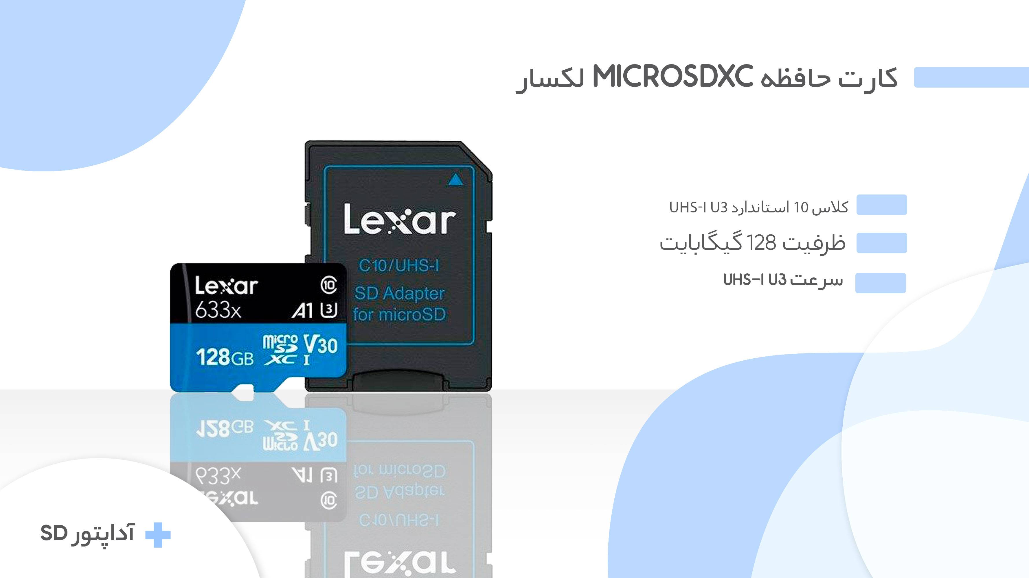 کارت حافظههای« لکسار»، کلاس ۱۰ بوده و استاندارد سرعت در آن UHS-I U3 است. همچنین این کارت حافظه 128 گیگابایت ظرفیت دارد و microSDXC است. البته همراه با این کارت یک آداپتور SD هم وجود دارد که در صورت نیاز میتوانید از آن برای اتصال کارت حافظه به لپتاپ یا کامپیوترتان به طور مستقیم استفاده کرده و به اطلاعات ذخیره شده روی کارت بدون نیاز به کارتخوان، دسترسی پیدا کنید. سرعت خواندن اطلاعات در این مدل از محصولات لکسار ۹۵ مگابایت برثانیه است. مدل «V30 A1» از سری محصولات لکسار قابلیت پشتیبانی از فایلهای باکیفیت را دارد و برای پردازش نیاز به سختافزاری دارند که با آنها سازگار باشد و بتواند با سرعت قابل قبولی اطلاعات را پردازش کند. بنابراین اگر به دنبال کارت حافظهای هستید که علاوه بر سرعت بالا درخواندن و نوشتن اطلاعات در برابر ضربه وعواملی از این قبیل مقاومت داشته باشد، مدل V30 A1 انتخاب مناسبی خواهد بود.