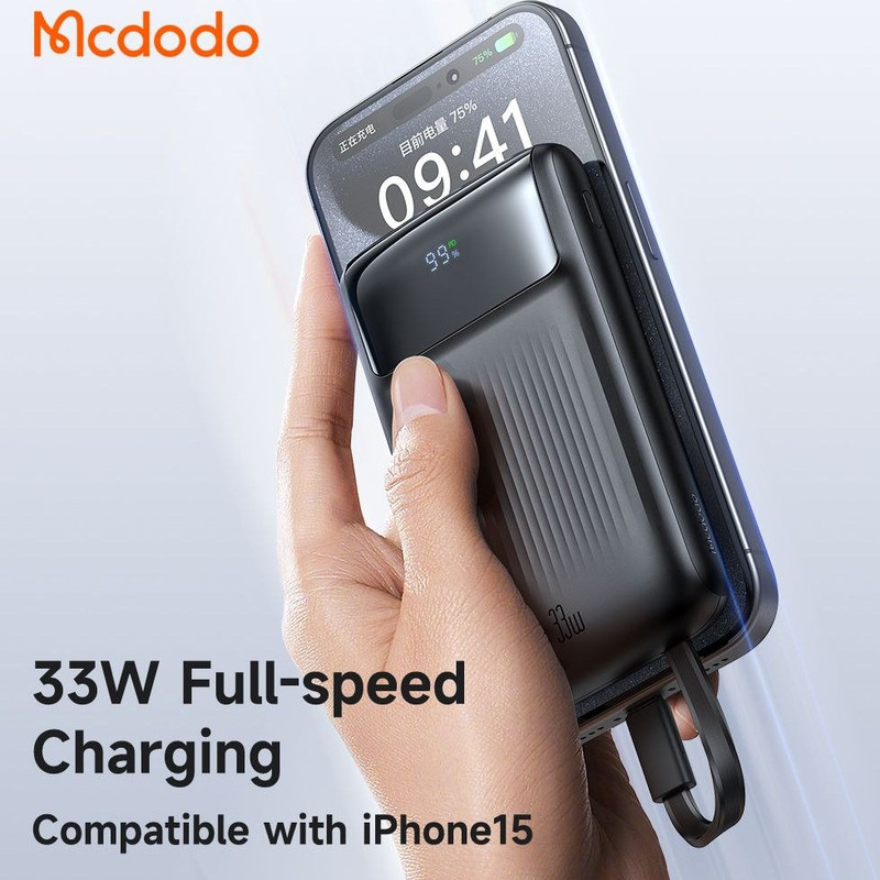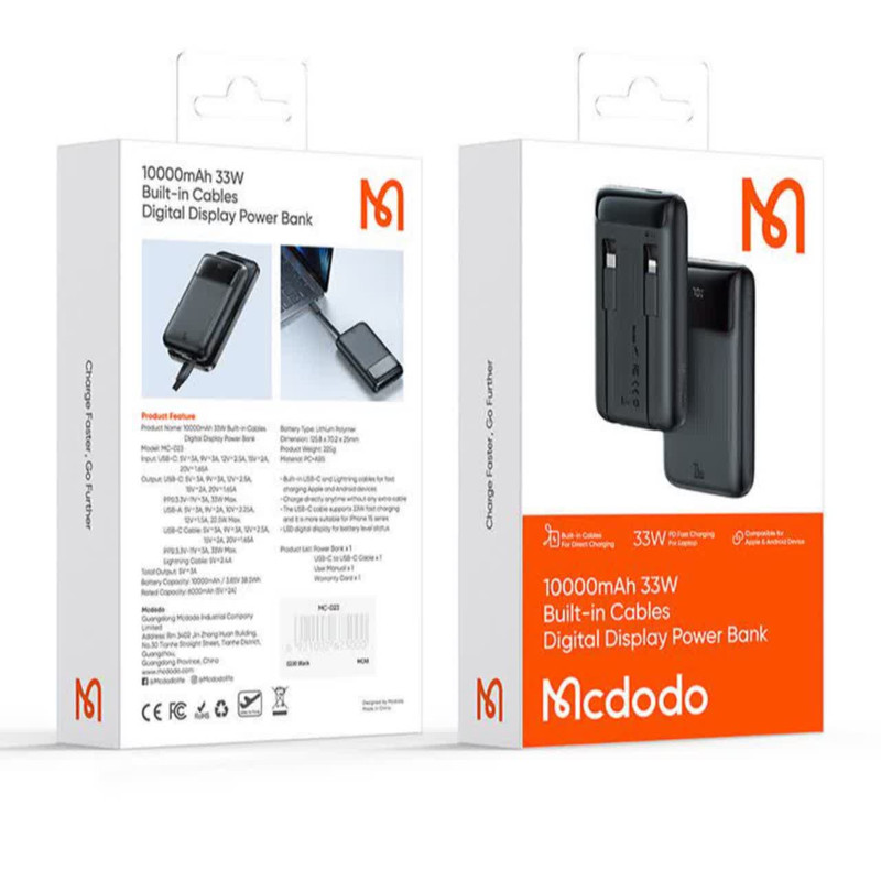 اگر شما اکثر مواقع بیرون از خانه هستید و احتیاج دارید که به صورت تمام وقت موبایل شما شارژ داشته باشد، باید یک وسیله ای تهیه کنید که بتواند موبایل شما را شارژ کند. اگر شما بخواهید یک وسیله کوچکی را داخل کیف خود قرار بدهید، بهتر است که یک پاوربانک تهیه کنید. پاوربانک ها بهترین گزینه برای خریداری است. زیرا پاوربانک انرژی را درون خود ذخیره سازی می کند و در صورت نیاز بتوانید دستگاه خود را شارژ نمایید. پاوربانک ها ظرفیت متفاوتی دارند که مشتریان نسبت به نیاز هایشان می توانند پاوربانک را انتخاب کنند. شرکت مک دودو در زمینه لوازم جانبی موبایل فعالیت دارد که همچنین این شرکت پاوربانک هم طراحی و تولید می کند. پاوربانکی که این شرکت طراحی کرده است مناسب تمامی موبایل های موجود در بازار است. این پاوربانک با مدل Mcdodo MC-0231 روانه بازار شده است. پاوربانک 33 واتی مک دودو مدل Mcdodo MC-0231 ظرفیت نامی آن 10 هزار میلی آمپر می باشد. این پاوربانک می تواند موبایل آیفون 15 را 1.5 تا 2 مرتبه شارژ می کند. این پاوربانک دو پورت خروجی دارد که یک پورت آن تایپ سی و یک پورت USB-A می باشد. هر دو پورت آن از شارژ سریع پشتیبانی می کند. پاوربانک 10000 میلی آمپر مک دودو مدل Mcdodo MC-0231 توان خروجی 33 واتی دارد. این پاوربانک دارای فناوری PPS می باشد که از شارژ سوپر فست شارژ پشتیبانی می کند. این پاوربانک دو کابل متصل هم دارد که یک کابل تایپ سی و یک کابل لایتنینگ می باشد. یک صفحه نمایشگر بر روی پاوربانک است که به فشار دادن دکمه پاور آن درصد دقیق پاوربانک را نشان می دهد. پاوربانک 10000 میلی آمپر 33 واتی مک دودو مدل Mcdodo MC-0231 یک ورودی تایپ سی دارد و یک ورودی لایتنینگ دارد. از پورت تایپ سی می توانید به صورت فست شارژ پاوربانک را شارژ کنید.
